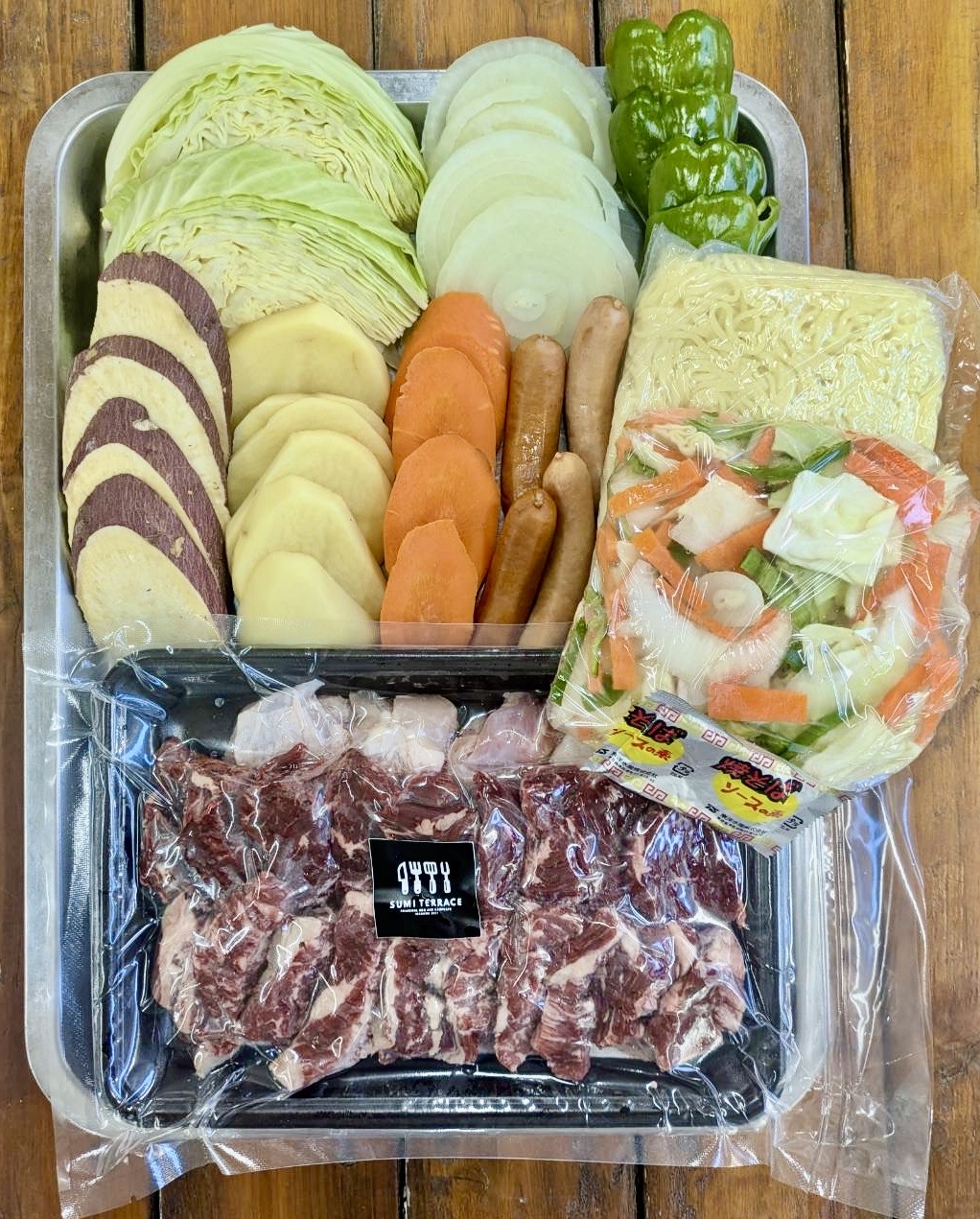 ![]() | セット内容: お肉 計500g ・やわらか牛カルビ ・やわらか牛ハラミ ・鶏もも ソーセージ 野菜 ・キャベツ、人参、じゃがいも、たまねぎ、ピーマン、さつまいも 焼きそば麺(カット野菜付) ※ 写真は2名様分です |